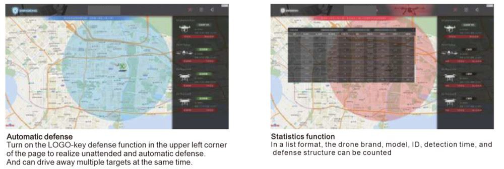 Za bespilotne letjelice možete odabrati: Jedan-ključ automatske odbrane: Nakon što se aktivira funkcija odbrane sistema, dron će automatski biti zaštićen od strane sistema bez osoblja na dužnosti; Ručna intervencija: Možete ručno odabrati da branite bilo koju bespilotnu letjelicu i način na obranu od vremena, ili da prekinete odbranu, a možete odabrati i locirati pilota.